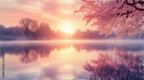 Fototapeta premium Blooming cherry tree branches reflecting on misty lake at sunrise