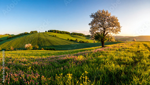© bazou, Obraz premium Blooming Cherry Tree in a Lush Green Rolling Hill Landscape During Golden Hour