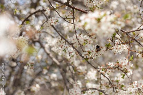 Obraz premium blooming cherry tree with write flowers in spring and bumblebee