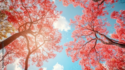 © Biancaart, Fototapeta premium Blooming Cherry Trees Against a Sunny Sky with Sunlight Bursting Through