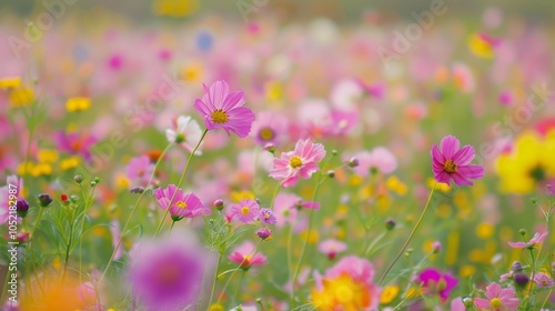 Naklejka premium Blooming cosmos flower field. Vibrant cosmos flowers paint a picturesque scene, symbolizing beauty, tranquility, and the joys of spring.