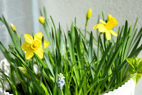 Fototapeta premium Blooming daffodils and grape hyacinths in a white flower pot