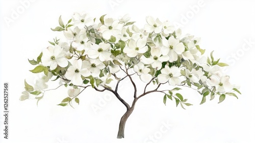 Fototapeta premium Blooming dogwood tree, spring blossoms, white flowers, isolated, nature illustration