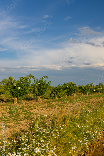 Naklejka premium Blooming elderberries orchard, Zemplin hills, Hungary