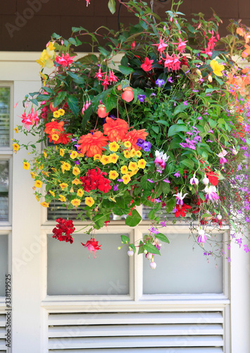 © Iriana Shiyan, Fototapeta premium Blooming flowers amazing complex baskets hanging pots near small luxury lodge exterior.
