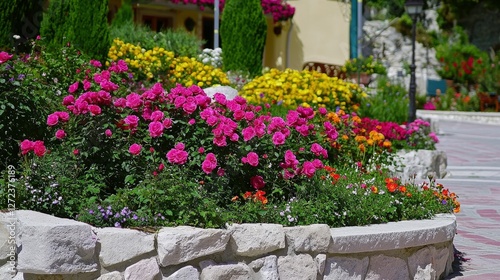 Naklejka premium Blooming flowers in a garden, with decorative rocks, next to a building, ideal for promoting tourism
