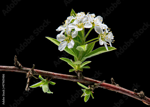 © DenisNata, Obraz premium Blooming flowers of white Spirea bush isolated on white background, close-up.