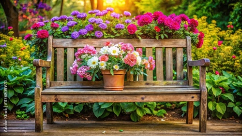 © Watcharapon, Fototapeta premium Blooming flowers on wooden garden bench , garden flowers, plants, garden flowers, plants, outdoor