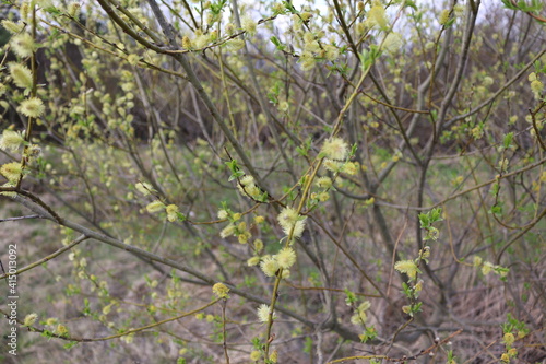 Fototapeta premium Blooming fluffy willow branches in spring close-up on nature macro