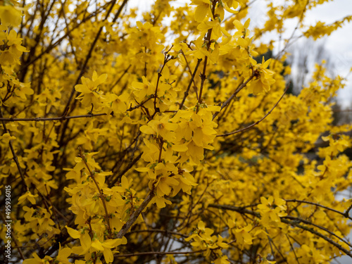Fototapeta premium Blooming forsythia spring yellow beautiful bright flowers