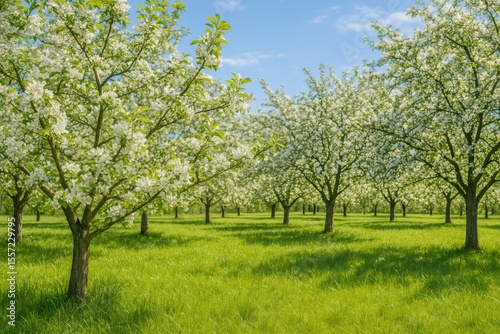 © TheWaterMeloonProjec, Fototapeta premium Blooming fruit trees in a lush meadow under clear spring skies