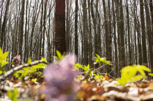 Fototapeta premium Blooming green forest, spring nature background, spring flowers