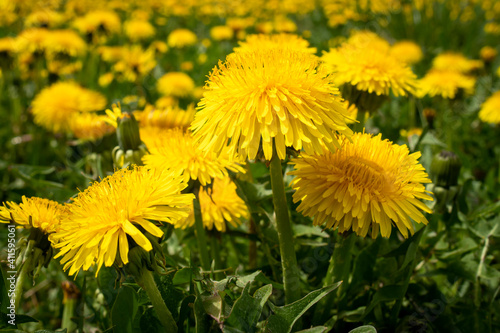 Fototapeta premium Blooming group of dandelions on meadow, Czech Republic