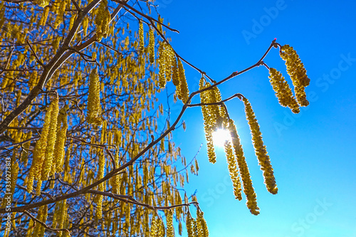 © Reinhard Tiburzy, Naklejka premium Blooming hazelnut tree in early spring, close-up
