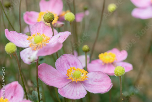 © Amalia Gruber, Fototapeta premium Blooming Japan anemone (Anemone hupehensis) with pink blossoms. Copy space.