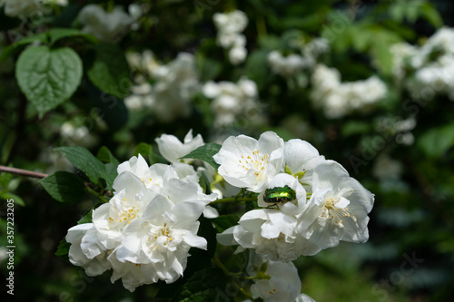 © Nariman, Obraz premium Blooming jasmine bush with green leaves