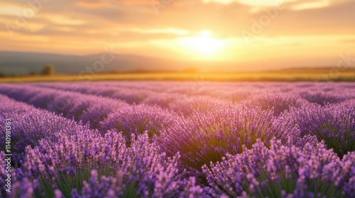 Naklejka premium Blooming lavender field at golden hour, glowing softly