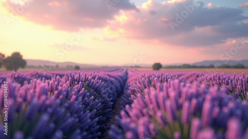 © Xavi, Naklejka premium Blooming lavender field at sunset with colorful sky and distant mountain range
