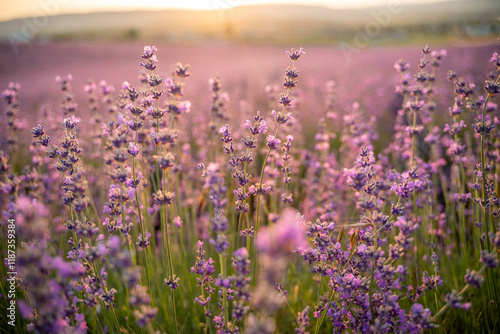 © svetograph, Naklejka premium Blooming lavender field. Beautiful purple flowers. Regional organic cultivation.