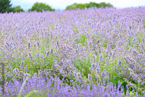 Naklejka premium Blooming Lavender Field in Full Purple Glory under Summer Sky, Furano, Hokkaido, Japan