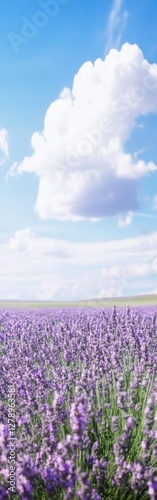 Fototapeta premium Blooming lavender field under a bright sky with clouds and vibrant colors in...
