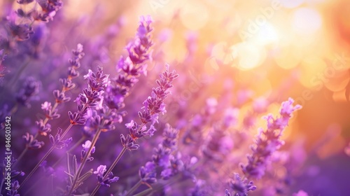 Fototapeta premium Blooming lavender in a field at sunset. Close up.