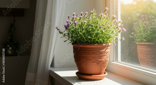 Fototapeta premium Blooming lavender in a terracotta pot on a sunlit windowsill creating a...