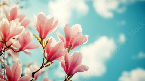 Fototapeta premium Blooming magnolia flowers under a clear blue sky in springtime