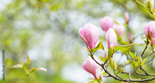 Fototapeta premium Blooming magnolia tree in spring with soft light and blurred...