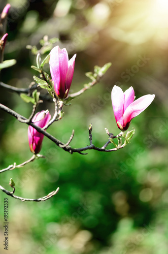 Fototapeta premium Blooming magnolia tree in the spring sun rays. Selective focus. Copy space. Easter, blossom spring, sunny woman day concept. Pink purple magnolia flowers.