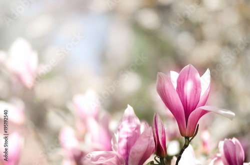Fototapeta premium Blooming magnolia tree in the spring sun rays. Selective focus. Copy space....