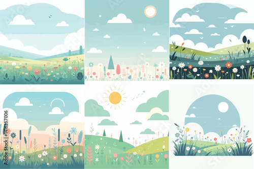 © Ayu, Naklejka premium Blooming Meadow and Field Landscape Illustrations with Sky