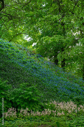 © newrita, Obraz premium Blooming mountainside on the background of a large tree