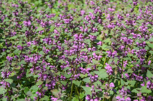 © Cliff, Naklejka premium Blooming nettle with blue flowers in the wind on a spring sunny day