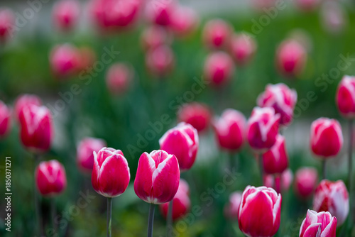 © Mindaugas Dulinskas, Obraz premium Blooming Orange, Magenta, Red Color Tulip Flowers.