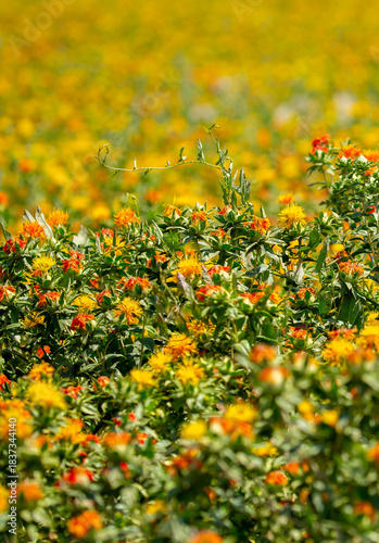 © Vera, Fototapeta premium Blooming orange safflower close-up. Safflower fields against the backdrop of mountains. Industrial cultivation of safflower for oil production.