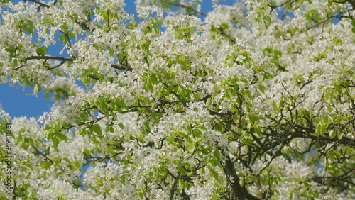 Obraz premium Blooming Pear Tree. White Flowers On A Tree In Soft Sunset Sunlight. Bright...