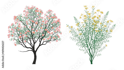 Obraz premium Blooming Pink and Yellow Flowering Trees and Shrubs, Digital Illustration