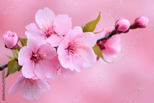 Fototapeta premium Blooming pink cherry blossom flowers on branch with pink background
