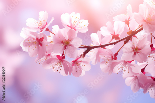 © Pakhnyushchyy, Obraz premium Blooming pink flowers of sakura cherry blossom season in springtime close up. Nature background