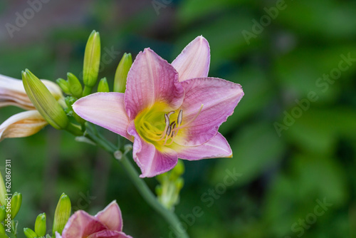 Fototapeta premium Blooming pink lily on a green background on a summer sunny day macro...