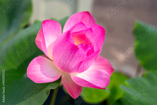 Fototapeta premium Blooming pink lotus flower, close-up. Aquatic sacred plant