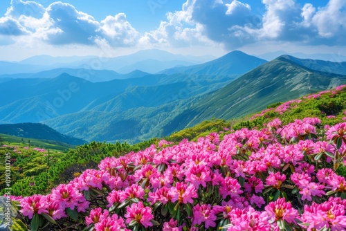 © Michael, Fototapeta premium Blooming pink rhododendrons in a mountain valley