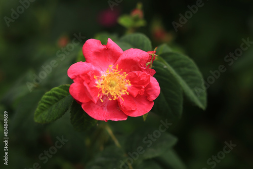 © Mariia, Fototapeta premium Blooming pink rose, flowers close-up. Flowers in a park or garden. Gardening. Growing roses. Beautiful pink flowers among green leaves. Shrub roses in spring. Natural floral background