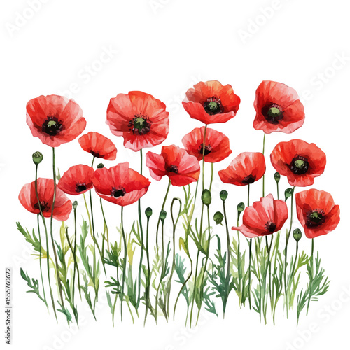 © AMIDCO, Fototapeta premium Blooming Poppies Wide Field, watercolor drawing vector, isolated on a white background.
