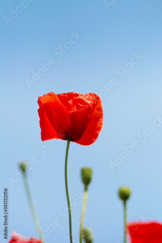Naklejka premium Blooming poppy field. Red poppy flower close up