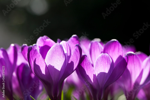 Fototapeta premium Blooming purple crocus flowers in a soft focus on a sunny spring day