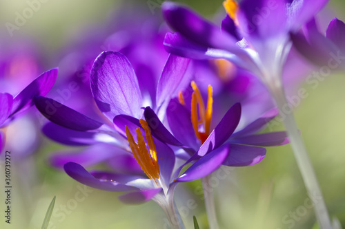 Fototapeta premium Blooming purple crocus flowers in a soft focus on a sunny spring day