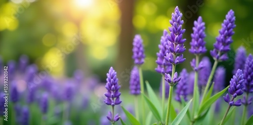Obraz premium Blooming purple lavender flowers in a serene garden setting, tranquil, summer