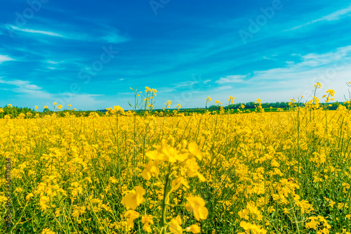 © etraveler, Obraz premium Blooming rapeseed field against the blue sky. Canola flowers.